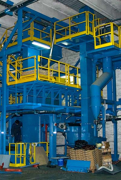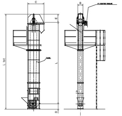 Gli elevatori serie E della GVF Impianti Srl sono progettati per lavorare in ambienti particolarmente gravosi e presentano un fondo rinforzato con materiale antiusura in Acciaio al Manganese tipo Creusabro, un'introduzione particolarmente studiata per eliminare i residui sul fondo e tazze in acciaio al carbonio o AISI 304 con riporti antiusura sul bordo d'attacco. Il gruppo di comando completo di motoriduttore pendolare e gruppo di tensionamento è reso smontabile in due parti in modo da poter garantire una facile manutenzione ed una sostituzione agevole del tappeto. Il gruppo di comando è formato da un tamburo gommato su albero calettato per un'agevole sostituzione, il gruppo di rinvio è costituito da una gabbia di scoiattolo con controconi di pulizia. sono presenti rulli di guida su cuscinetti sia sulla testata che sul gruppo rinvio. Gli elevatori a tazze GVF Impianti Srl ossono essere costruiti anche con trascinamento a catena e tazze speciali.